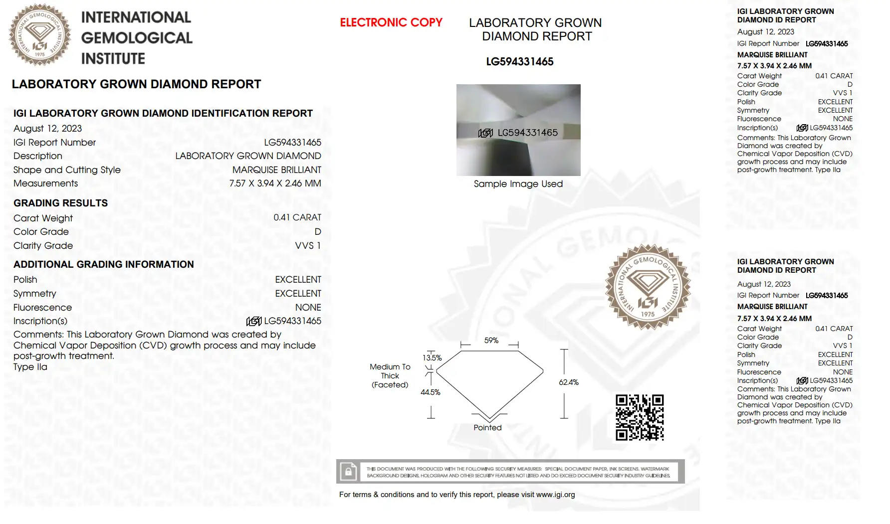 0.41 Carat CVD Marquise shape lab grown diamond D VVS1 IGI Certified