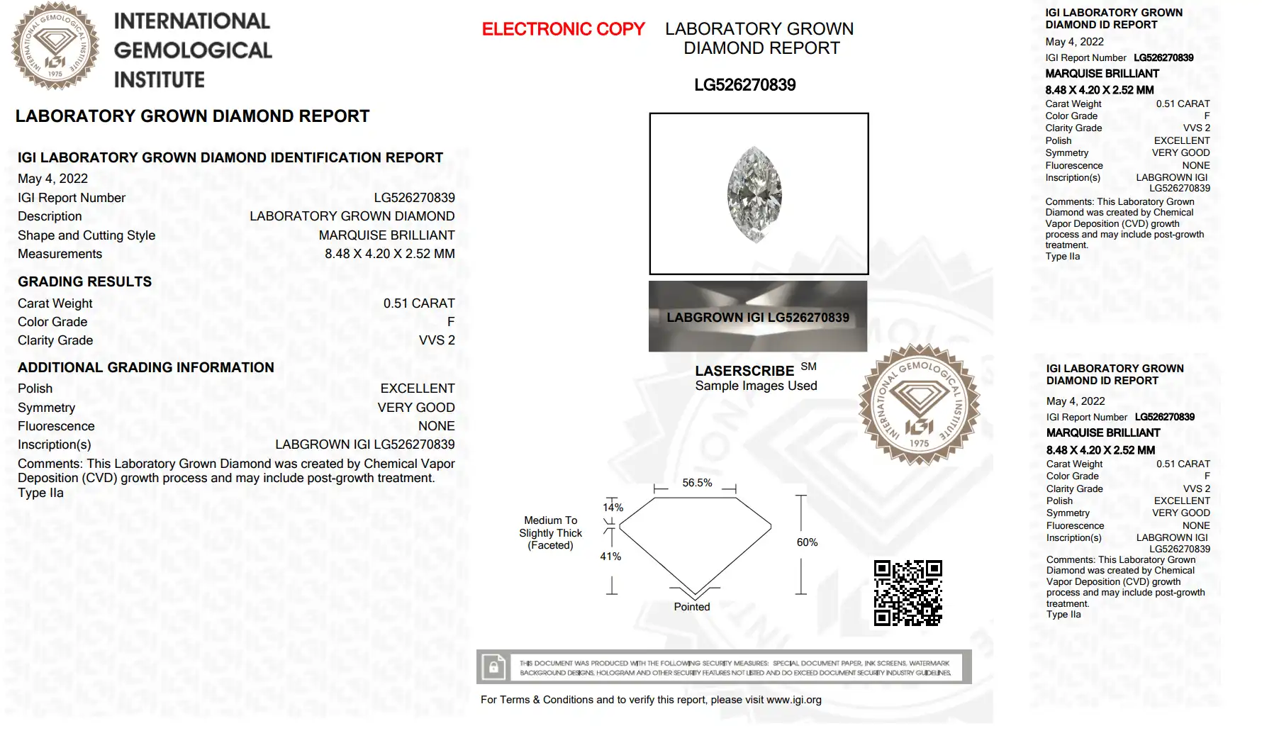 0.51 Carat CVD Marquise shape lab grown diamond F VVS2 IGI Certified
