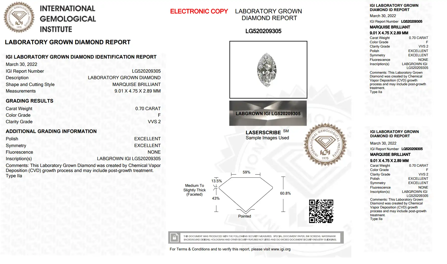 0.70 Carat CVD Marquise shape lab grown diamond F VVS2 IGI Certified