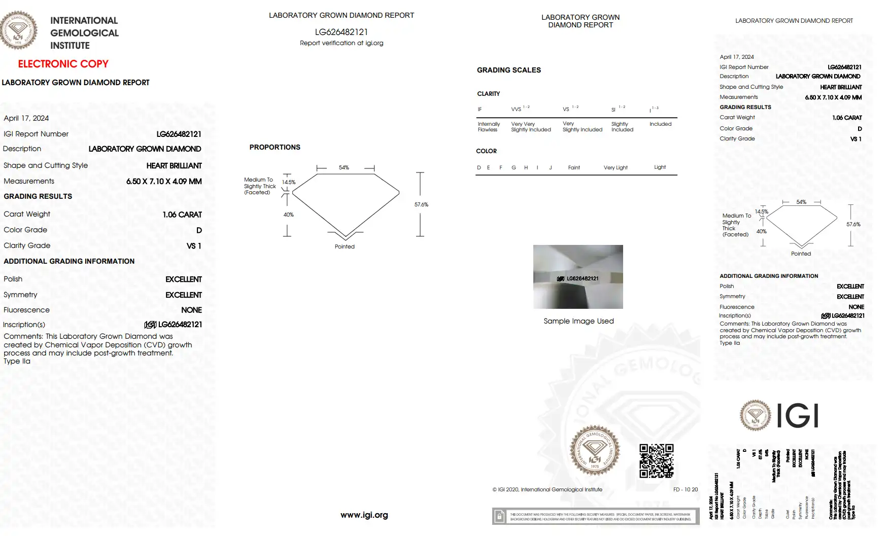 In summary, the 1.06 carat heart-shaped lab-created diamond with a D color grade and VS1 clarity, certified by a reputable institute, is a stunning choice for jewelry, offering elegance, purity, and ethical sourcing practices.