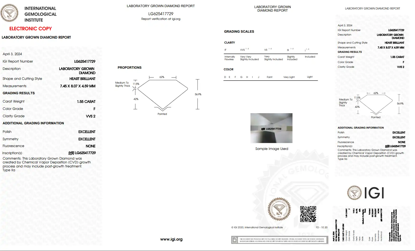 In summary, the 1.55 carat heart-shaped lab-grown diamond with an F color grade and VVS2 clarity, certified by a reputable institute, is a stunning choice for jewelry, offering elegance, purity, and ethical sourcing.