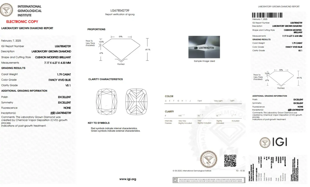 1.79 Carat Cushion Shape VS1 Clarity Vivid Blue Lab grown Diamond