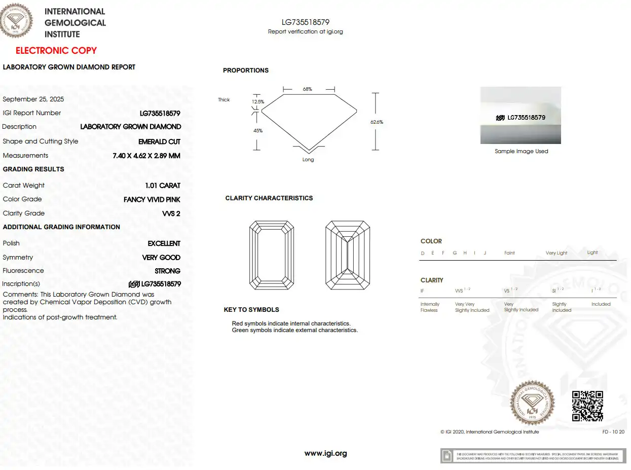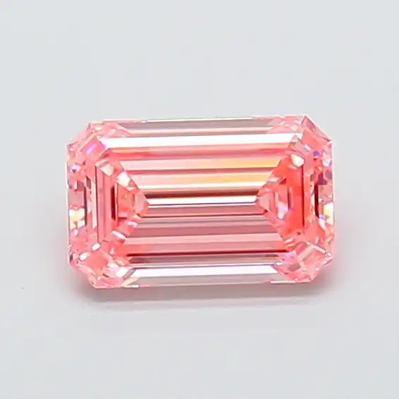 The 1 Carat Pink Diamond Emerald cut is a beautiful lab-grown diamond with a rich and vibrant pink color. It has an elegant emerald cut that gives a clean, classy look with step-cut facets and a mirror-like shine. With VVS2 clarity, the diamond looks very clean to the eye and shows excellent transparency.