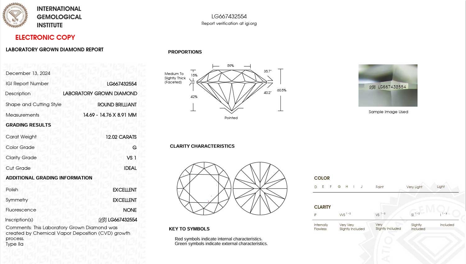 This is a 12 carat round diamond with G color and VS1 clarity. It has an ideal cut, which means it shines beautifully. The polish and symmetry are excellent, making it a high-quality diamond. This diamond is lab-grown (CVD Type IIA) and comes with an IGI certificate for authenticity. It is available from GPX Diamonds and is located in India. You can watch a video of this diamond and view its certificate online. If this diamond has already been sold, we can find a similar one for you. Before finalizing, we will discuss all details with you to ensure you get the perfect diamond.