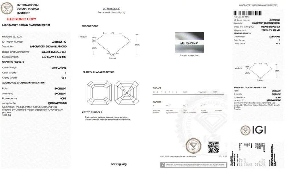 Our commitment to unparalleled craftsmanship shines through in every Asscher cut lab-grown diamond we offer. Each diamond undergoes rigorous certification by IGI, ensuring its authenticity, precision cut, and exceptional clarity. Whether you’re searching for a mesmerizing engagement ring, a pendant that narrates a story, or earrings that exude sophistication, our certified Asscher cut lab-grown diamonds encapsulate both grace and quality.