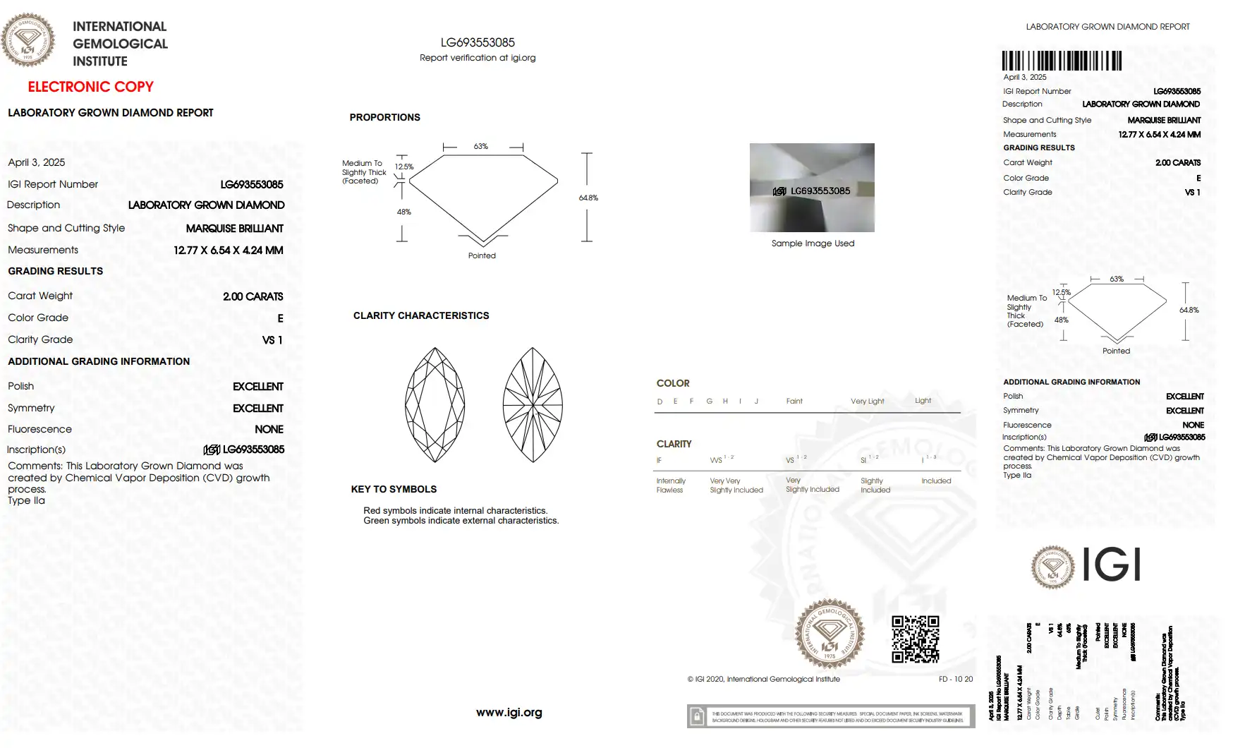 This 2 carat marquise-shaped lab grown diamond from GPX Diamonds exemplifies the highest standards in modern diamond craftsmanship. Grown in a controlled laboratory environment using advanced chemical vapor deposition (CVD) or high pressure high temperature (HPHT) methods, this diamond is chemically, physically, and optically identical to natural diamonds, but is a more sustainable and ethical choice. The marquise cut, known for its elongated shape with pointed ends, offers a distinctive and elegant appearance that maximizes surface area, making the stone appear larger than its actual carat weight?a desirable feature for those seeking maximum visual impact.