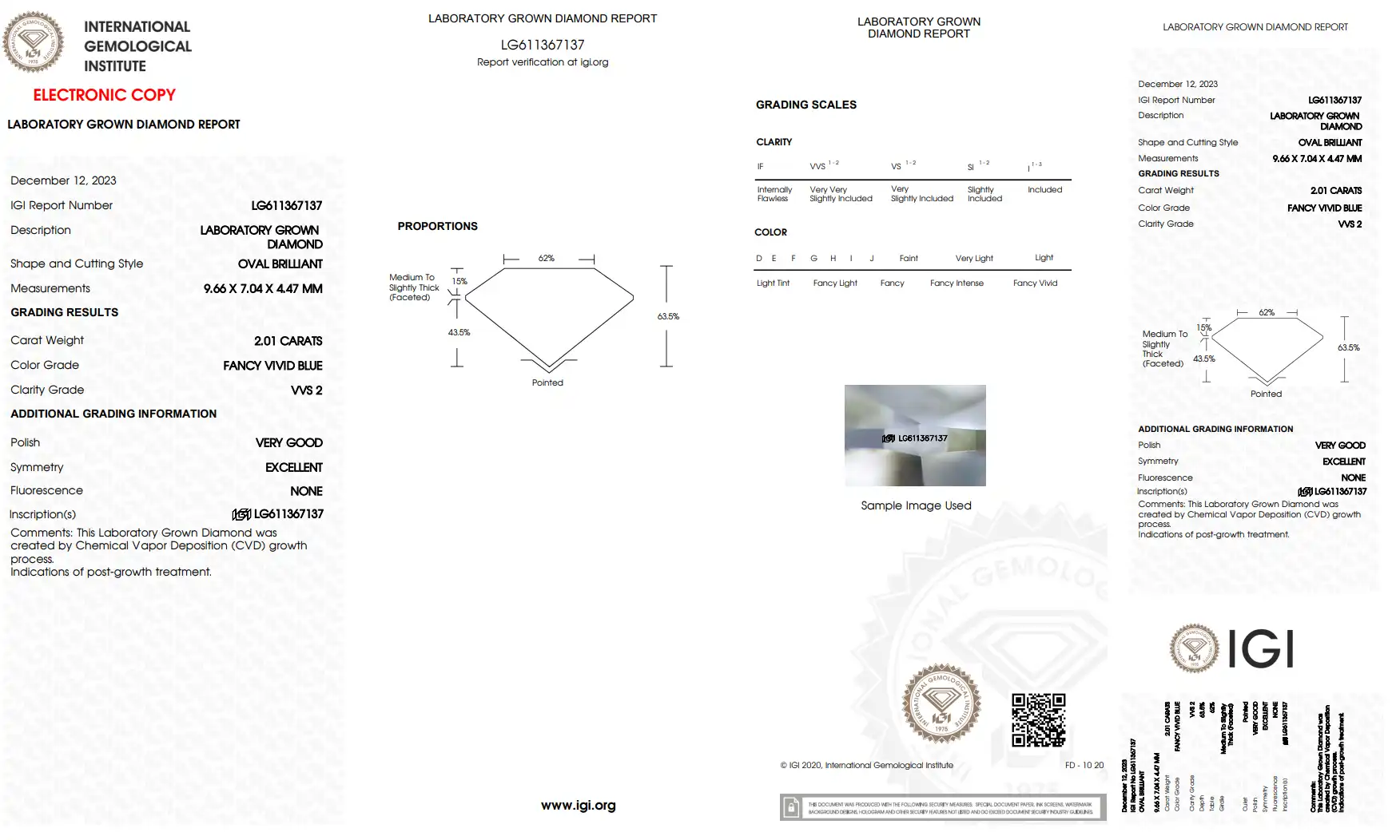 2.01 Carat FANCY VIVID BLUE OVAL shape VVS2 lab grown diamond | IGI Certified