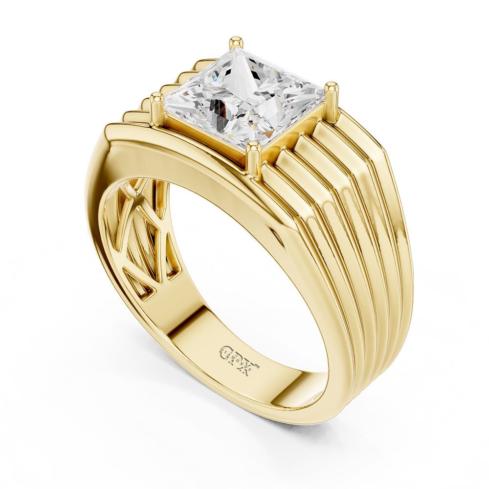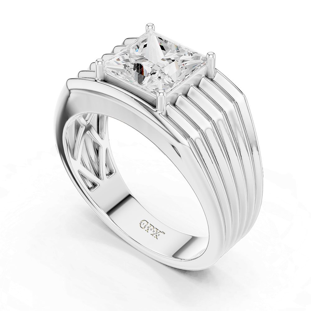 At the heart of the design is an impressive 3.00 carat lab-grown princess-cut diamond, set as a solitaire to command full attention. The princess cut, known for its sharp edges and brilliant light return, delivers a contemporary, architectural look that pairs perfectly with men’s jewellery aesthetics. The solitaire setting emphasizes the diamond’s size and symmetry while maintaining a strong, uncluttered design.