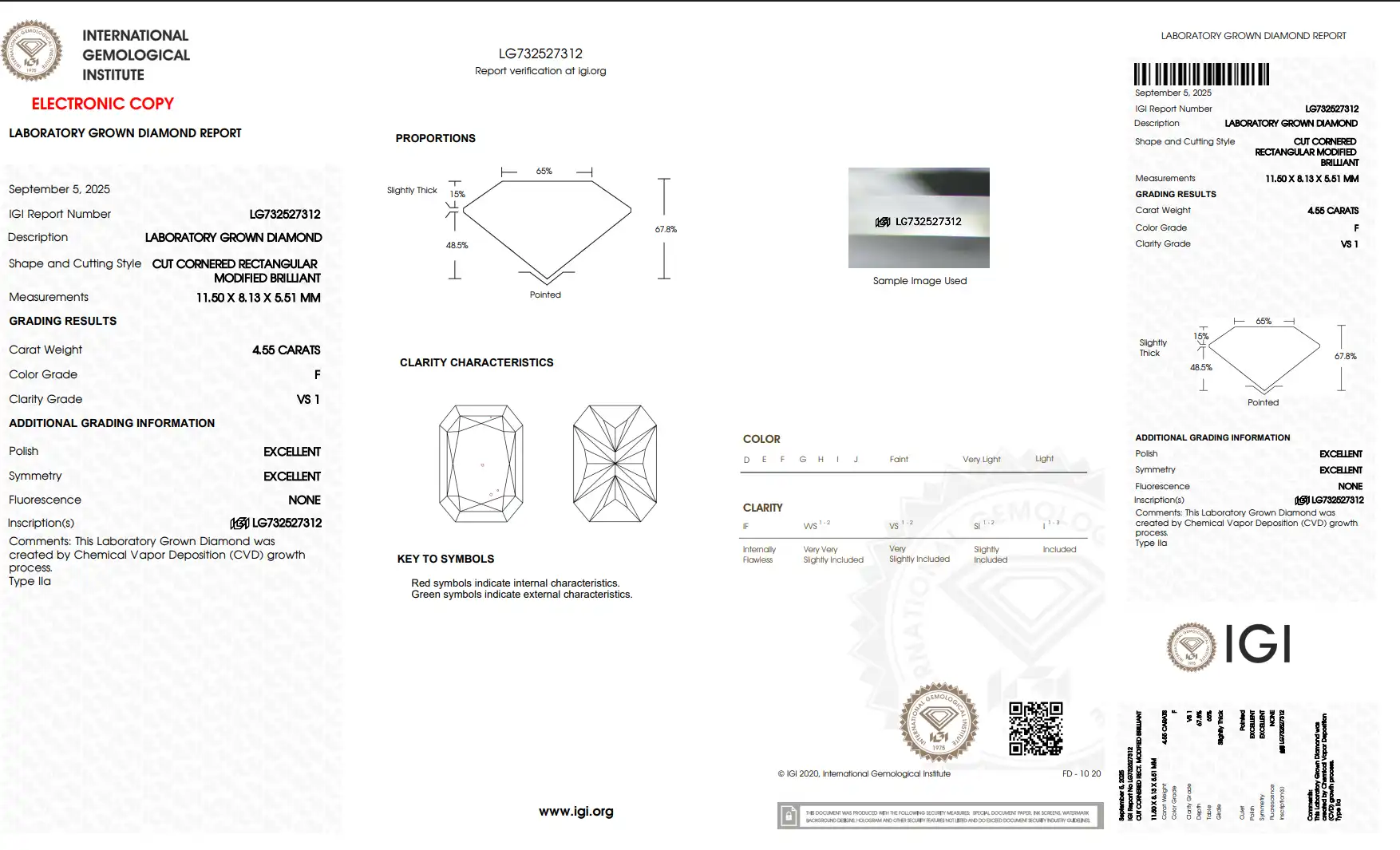 Ethically created through advanced laboratory technology, this lab grown diamond carries the same physical, chemical, and visual qualities as mined diamonds while representing a responsible and sustainable luxury choice. Its commanding 4.55-carat weight, paired with spectacular brilliance and perfectly balanced proportions, makes it an extraordinary centerpiece for bespoke fine jewellery.