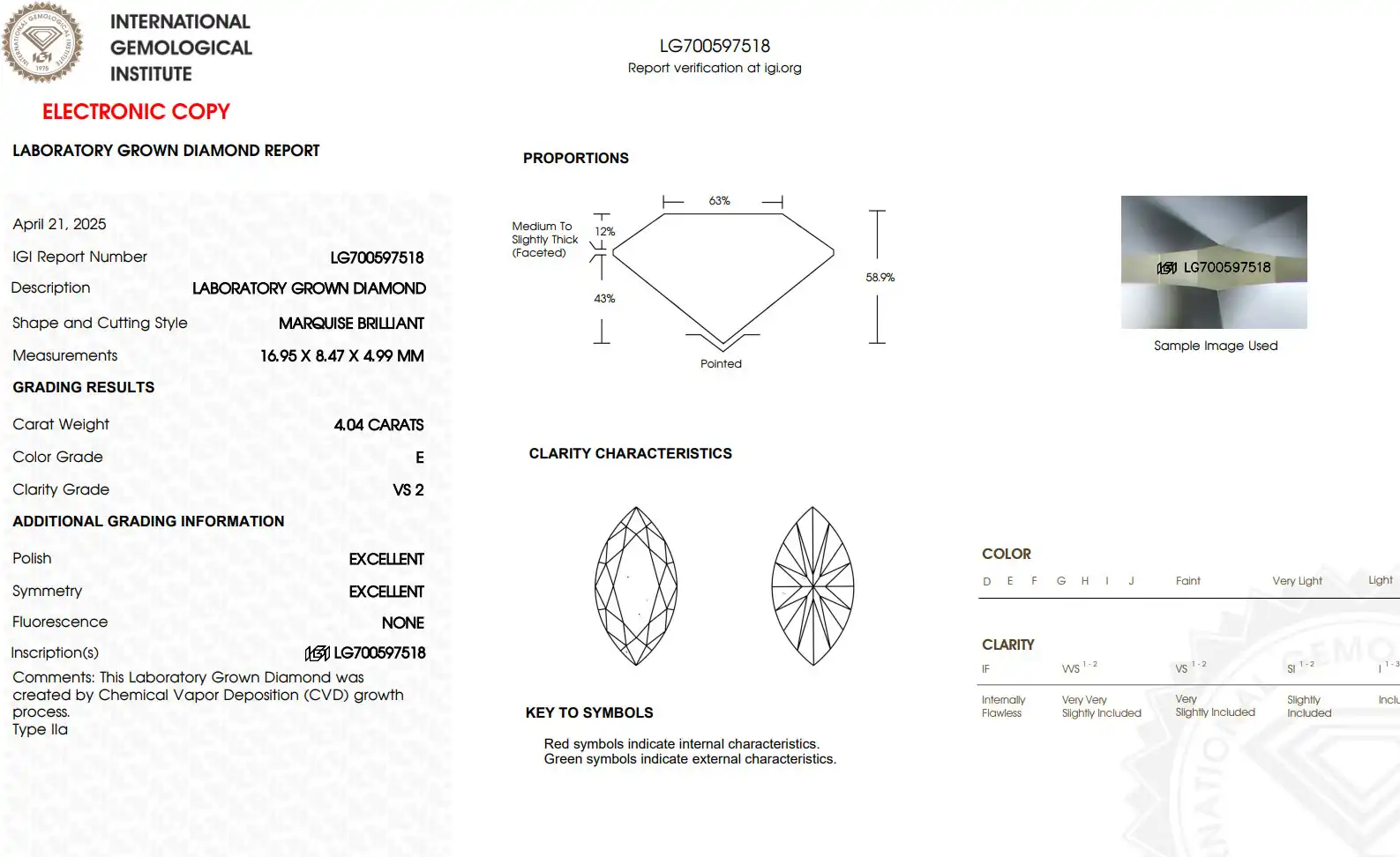This elegant 4.04 carat marquise-shaped lab grown diamond from GPX Diamonds combines timeless design with advanced technology and ethical sourcing. Grown in a laboratory under controlled conditions that mimic the earth?s natural processes, this diamond offers the same brilliance, hardness, and optical beauty as a mined diamond, but with a significantly lower environmental impact. Certified by the International Gemological Institute (IGI), this diamond is graded E in color, placing it in the “colorless” category, meaning it has no noticeable hue and appears bright, icy white. With a VS2 clarity rating, the stone contains minor inclusions that are still difficult to detect without magnification, ensuring a beautiful appearance with excellent value.