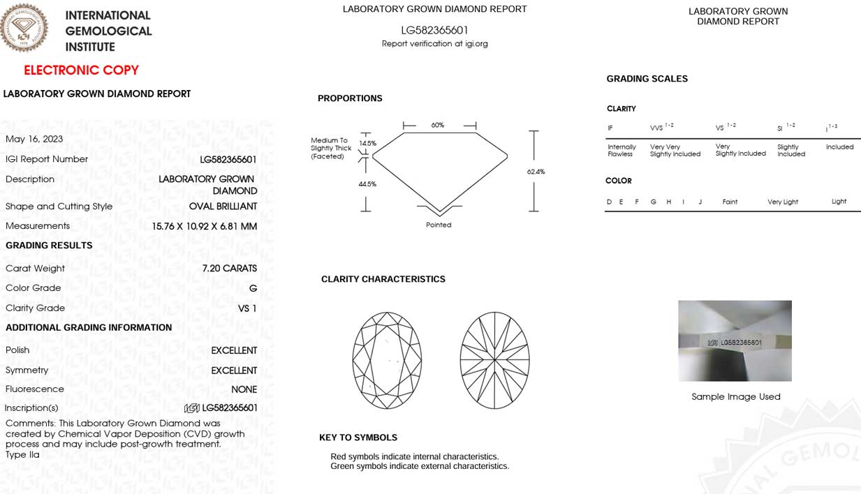 This 7 carat oval diamond is a real lab-grown diamond. It weighs 7.20 carats. The diamond is oval-shaped and has a G color. Its clarity is VS1. The diamond is certified by IGI. You can return it easily within 14 days. You can check the certificate anywhere in the world at any time.