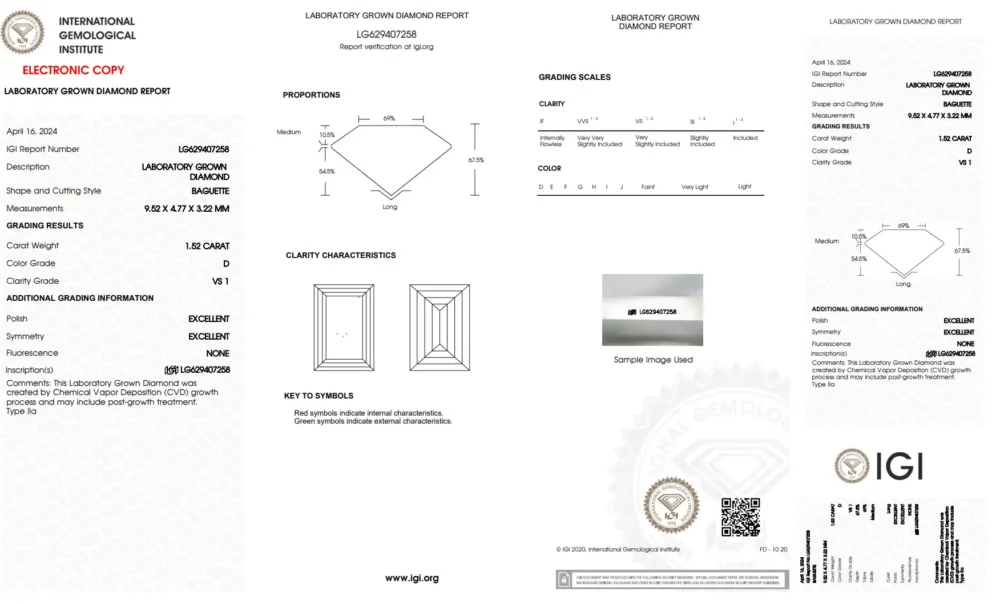 This elegant baguette-cut diamond weighs 1.52 carats and is lab-created, offering a sustainable and ethical choice. The diamond is colorless with a D color grade and has a clarity grade of VS1, indicating very slight inclusions that are challenging to see even under magnification. It comes with IGI certification, ensuring its quality and authenticity.