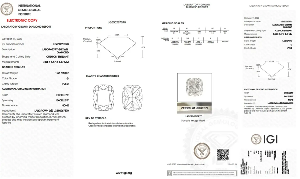 This cushion-cut diamond is lab-grown and weighs 1.58 carats. Its color is G, nearly colorless, and it has a VVS2 clarity, meaning very, very slight inclusions. It is IGI certified.