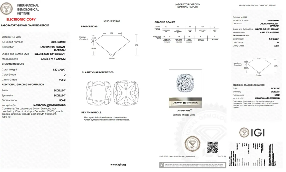This cushion-cut diamond is man-made and weighs 1.60 carats. It has a D color, which is the highest color grade, making it very white. The clarity is VVS2, meaning very, very slight inclusions. It is IGI certified.