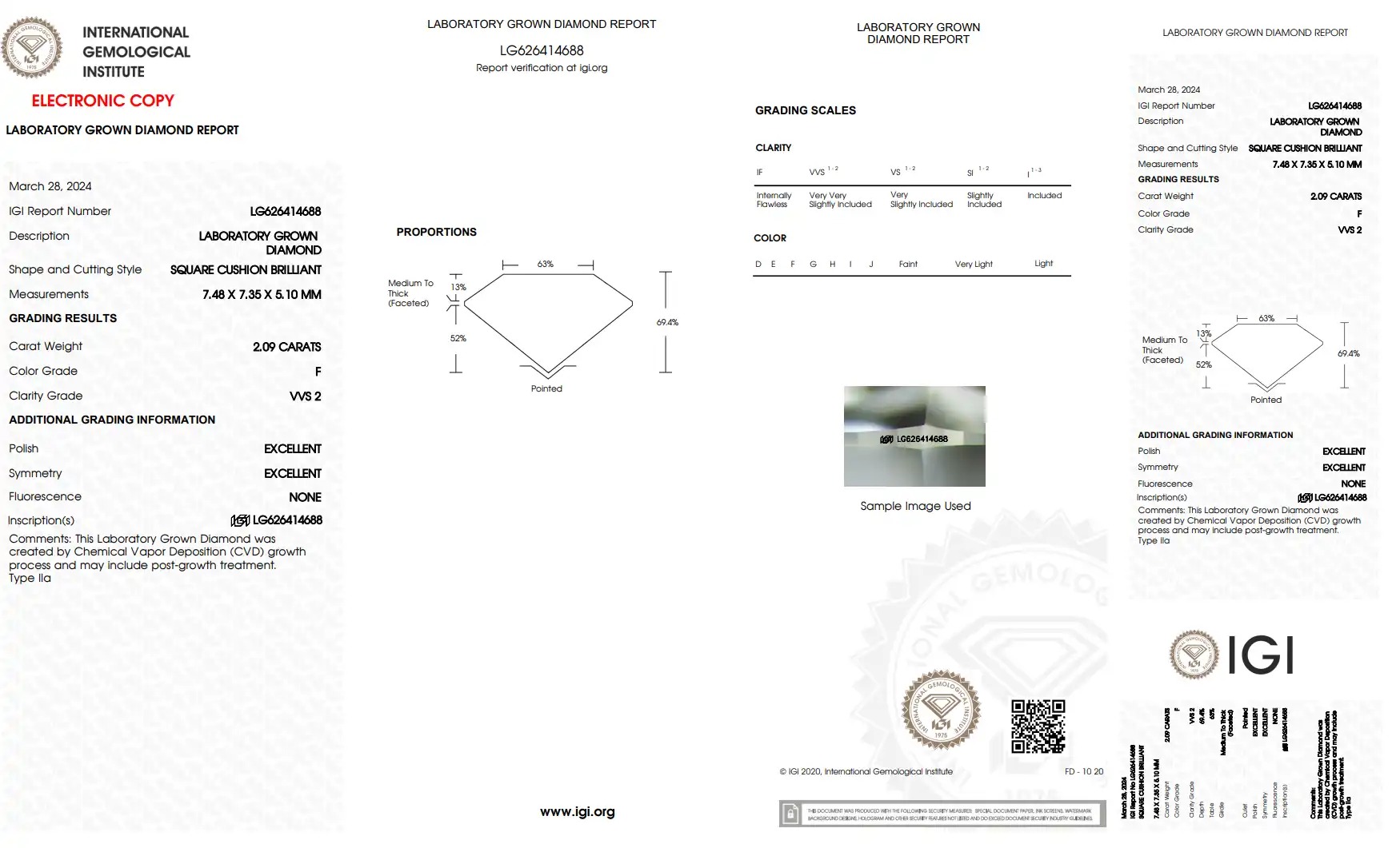 This is a cushion-shaped, lab-made diamond that weighs 2.09 carats. It has an F color, very white, and a VVS2 clarity, meaning very, very slight inclusions. It comes with an IGI certificate.