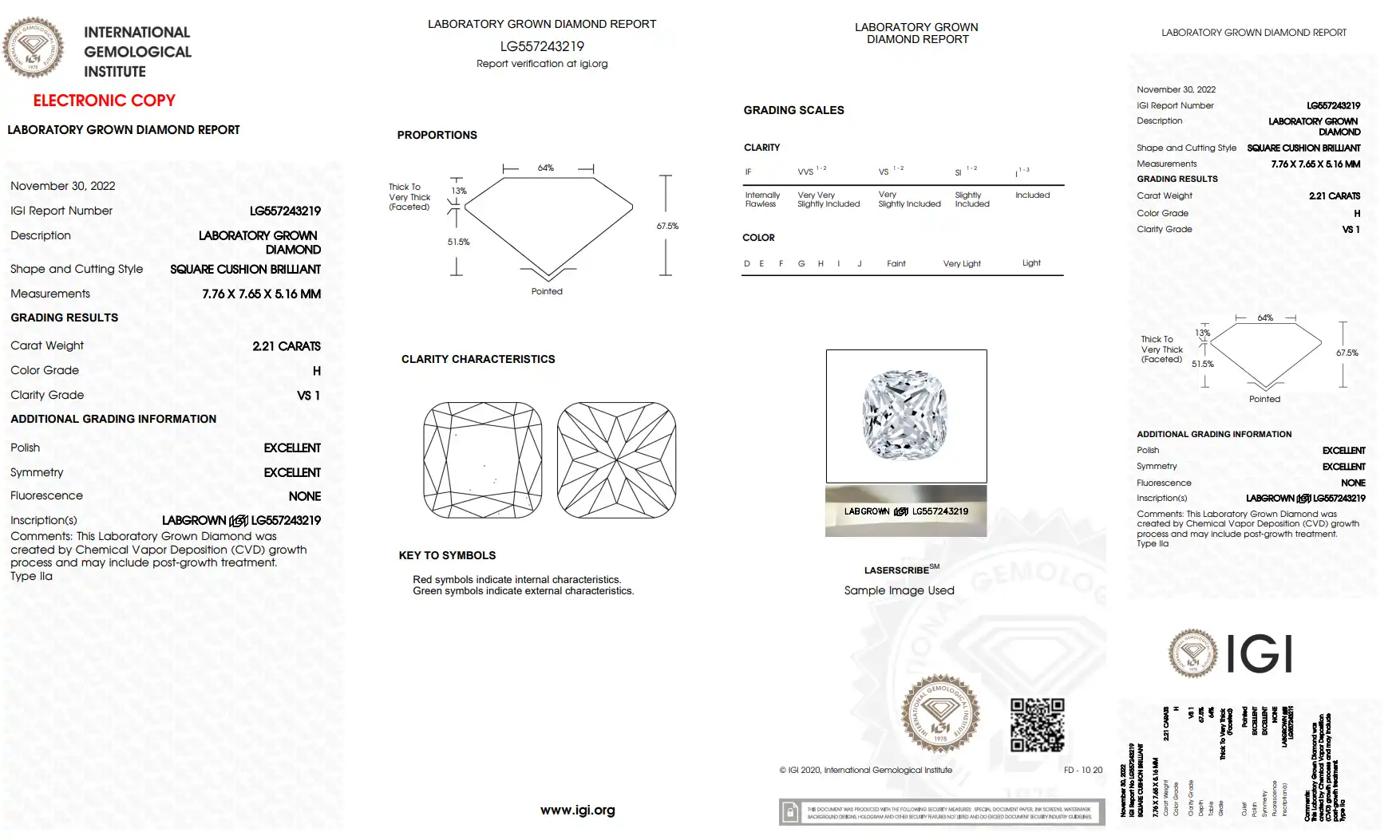 This cushion-shaped diamond is lab-created and weighs 2.21 carats. It has an H color, which is slightly less colorless than G, and a VS1 clarity, indicating very small inclusions. It is IGI certified.