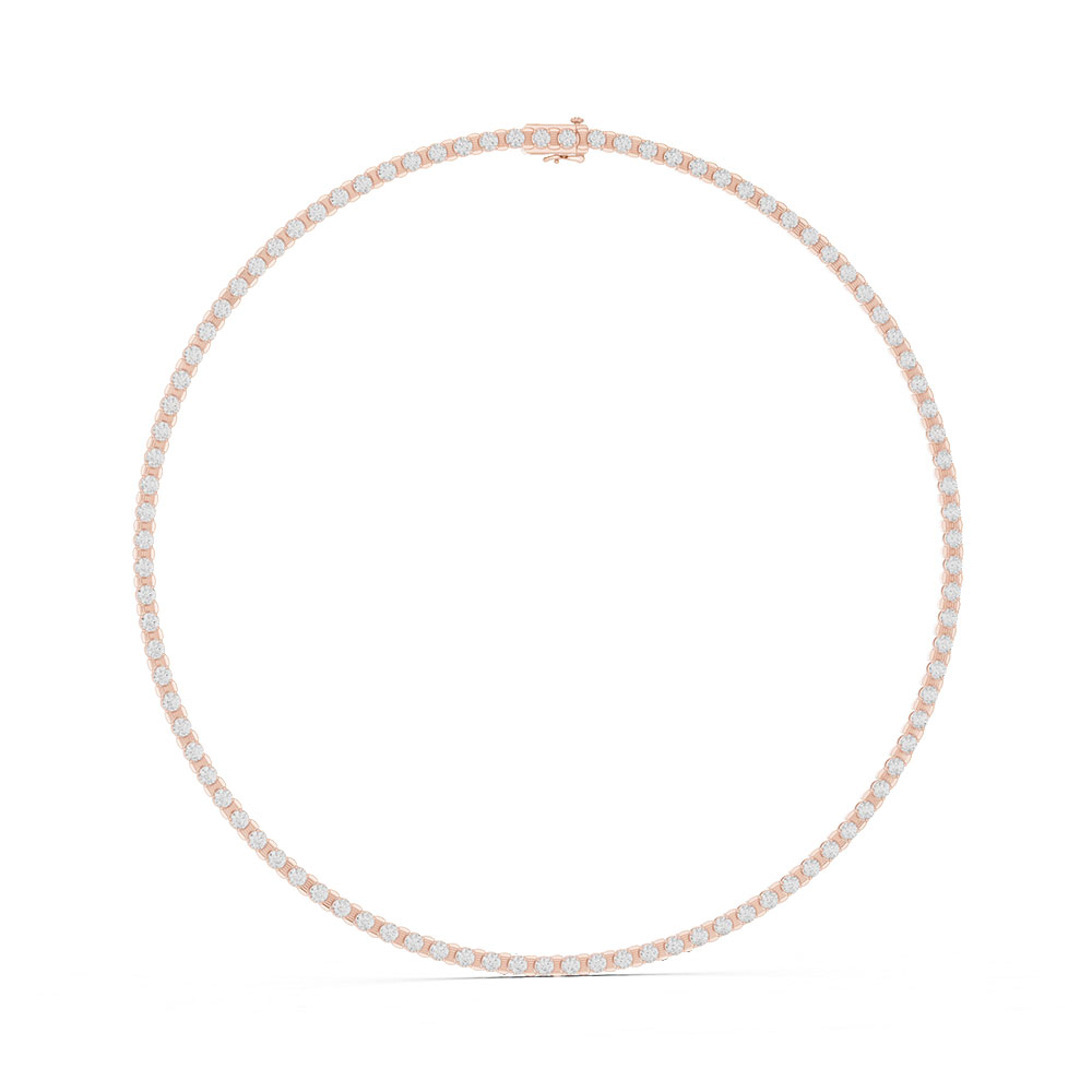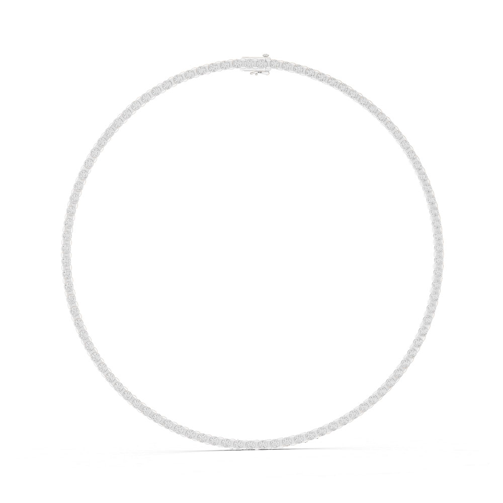 The necklace is adorned with 15 carats of lab-grown round-cut diamonds, carefully selected in EF color with VVS–VS clarity to deliver superior brilliance and sparkle. The round cut is renowned for its exceptional light performance, ensuring maximum fire and scintillation with every movement. Each diamond is precisely set to maintain uniform spacing and alignment, resulting in a seamless flow of light across the entire length of the necklace. All diamonds are certified, offering assurance of quality, ethical sourcing, and expert craftsmanship.