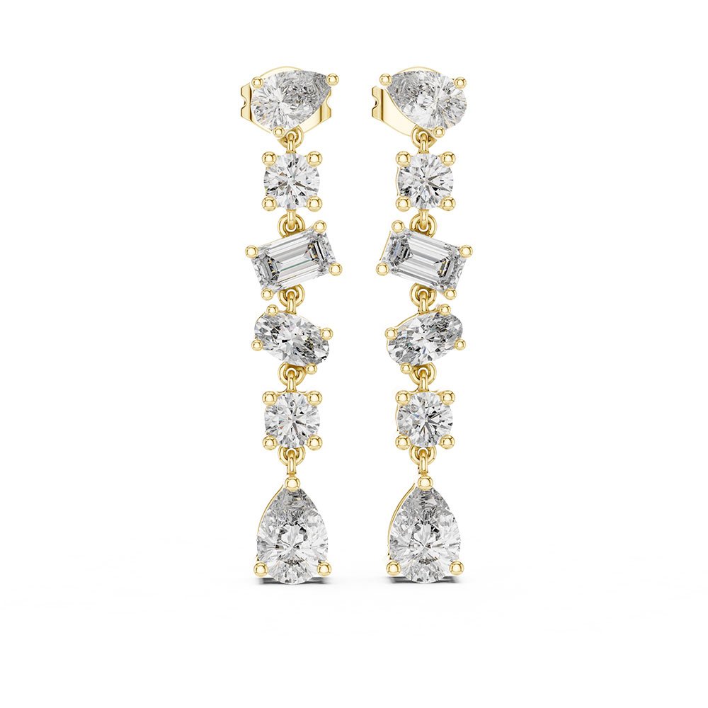 Adorned with a total of 3.00 carats of lab-grown diamonds (LGD), the design features a harmonious mix of round, pear, oval, and emerald-cut diamonds. This thoughtfully curated combination highlights the unique character of each cut—the round diamonds add classic brilliance, pear shapes introduce soft elegance, ovals create graceful elongation, and emerald cuts bring clean lines and refined sophistication. Together, they form a fluid dangle design that catches the light beautifully with every movement.