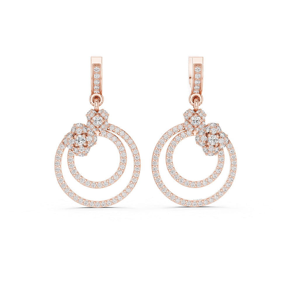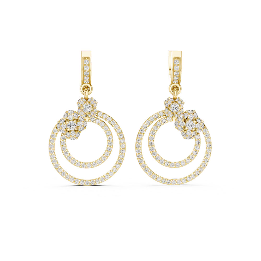 Each earring is adorned with 1 carat + 1 carat round brilliant CVD diamonds, carefully selected in the EFG color range with VS–VVS clarity. These certified diamonds are expertly cut to maximize fire and brilliance, delivering a radiant sparkle that catches the light from every angle. The round diamonds are securely set along the hoops, creating a continuous shimmer that accentuates the elegant curvature of the design.