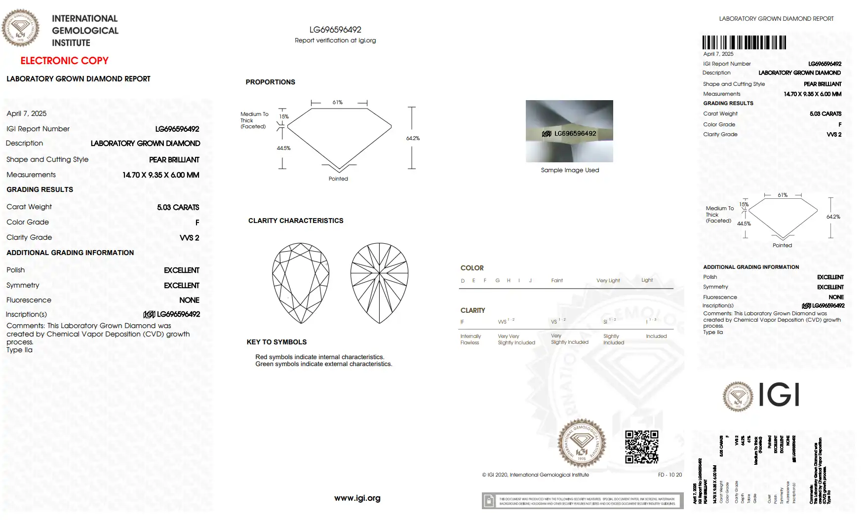 Elegant 5.03 Ct F VVS2 Pear Cut Lab Diamond | IGI Verified
