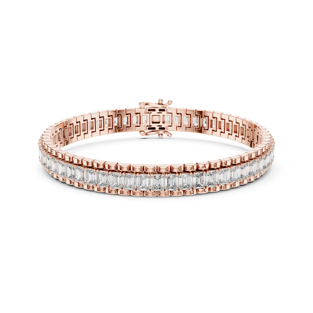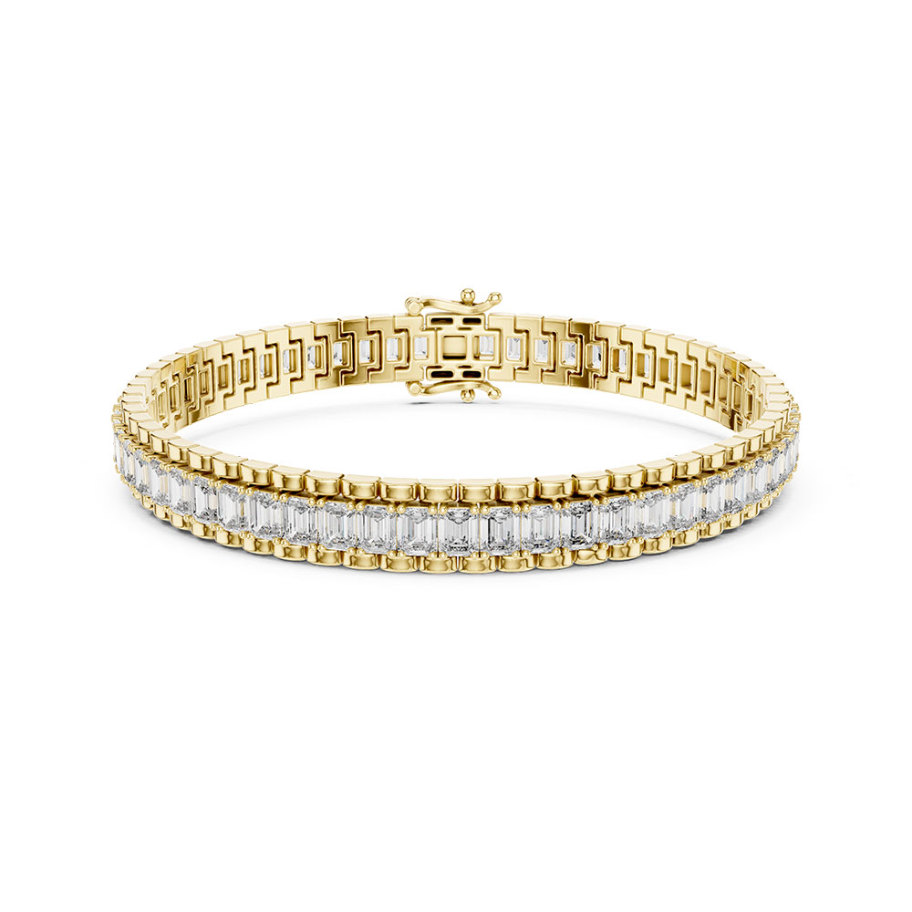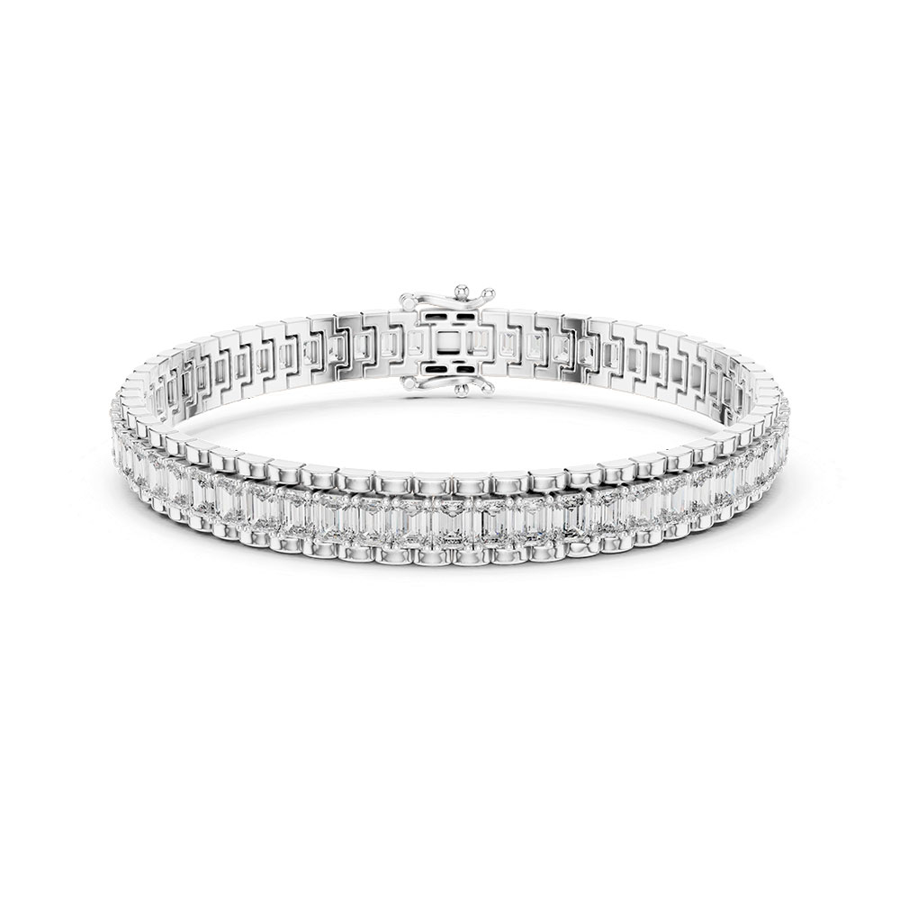 Set with an impressive 12 carats of DEF color diamonds in VS–VVS clarity, the bracelet offers exceptional brilliance with a sleek, mirror-like glow characteristic of emerald cuts. Each diamond is meticulously selected for its clarity, symmetry, and crisp step-cut facets, resulting in a sophisticated interplay of light and shadow. The elongated facets create a hall-of-mirrors effect, giving this bracelet a distinguished and high-end aesthetic.