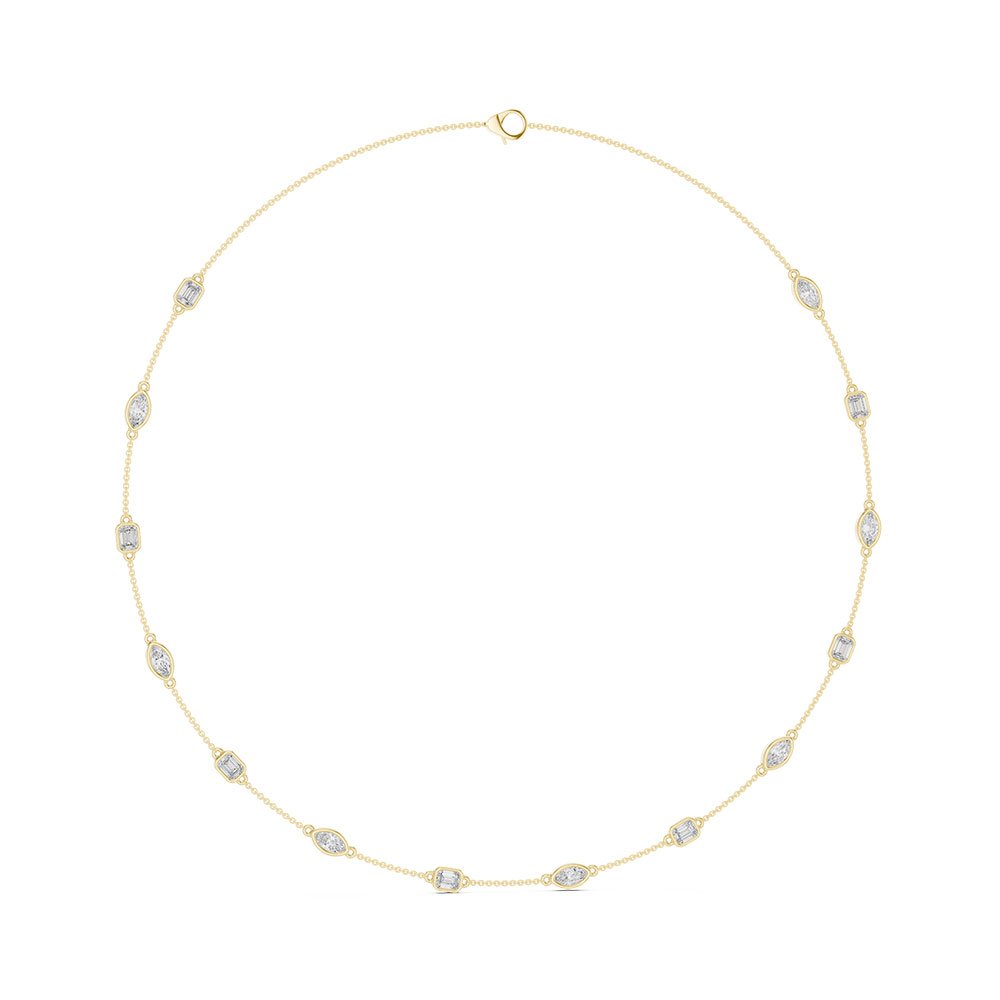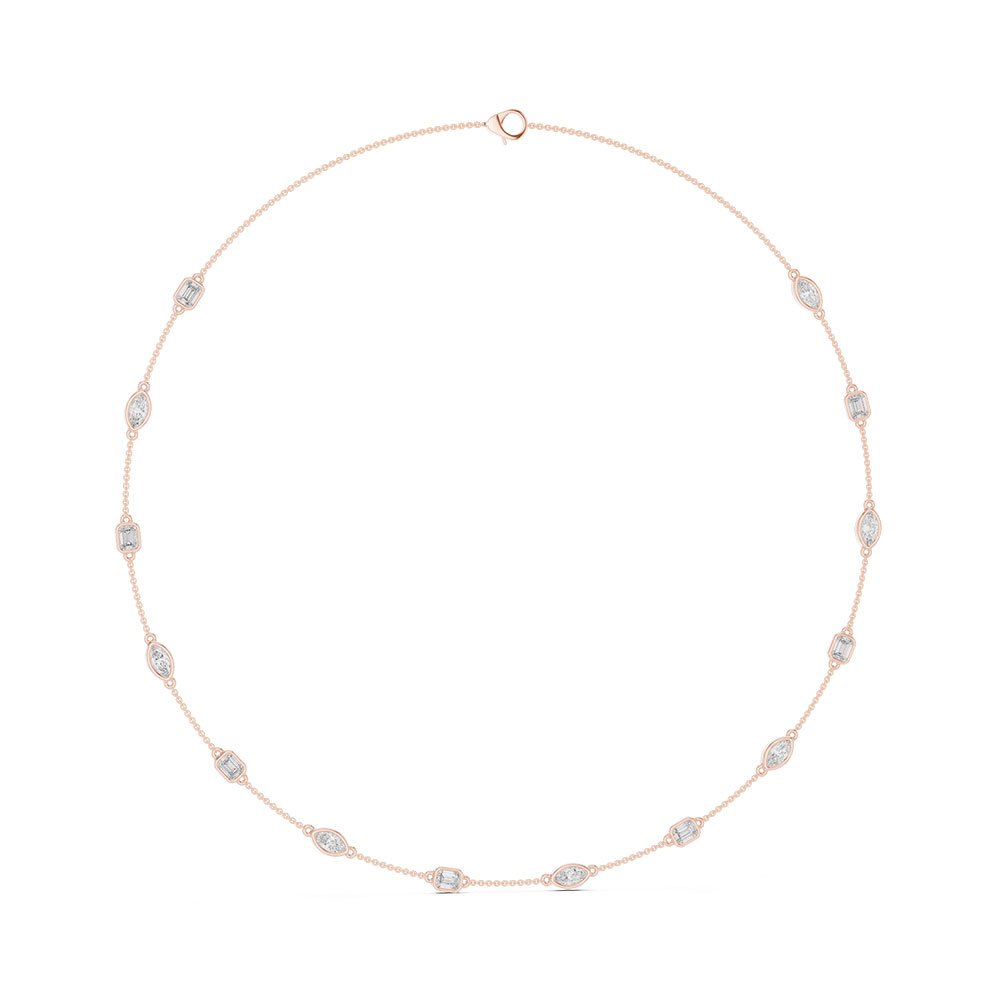 The necklace showcases a total diamond weight of 3 carats, set with a refined mix of emerald-cut and marquise-cut lab-grown diamonds. Emerald-cut diamonds are prized for their step-cut facets, offering a sophisticated, mirror-like brilliance and a timeless architectural look. Marquise-cut diamonds, with their elongated silhouette and pointed ends, add dynamic sparkle and a flattering visual flow. Together, these cuts create a contemporary yet classic design that feels both fresh and enduring.