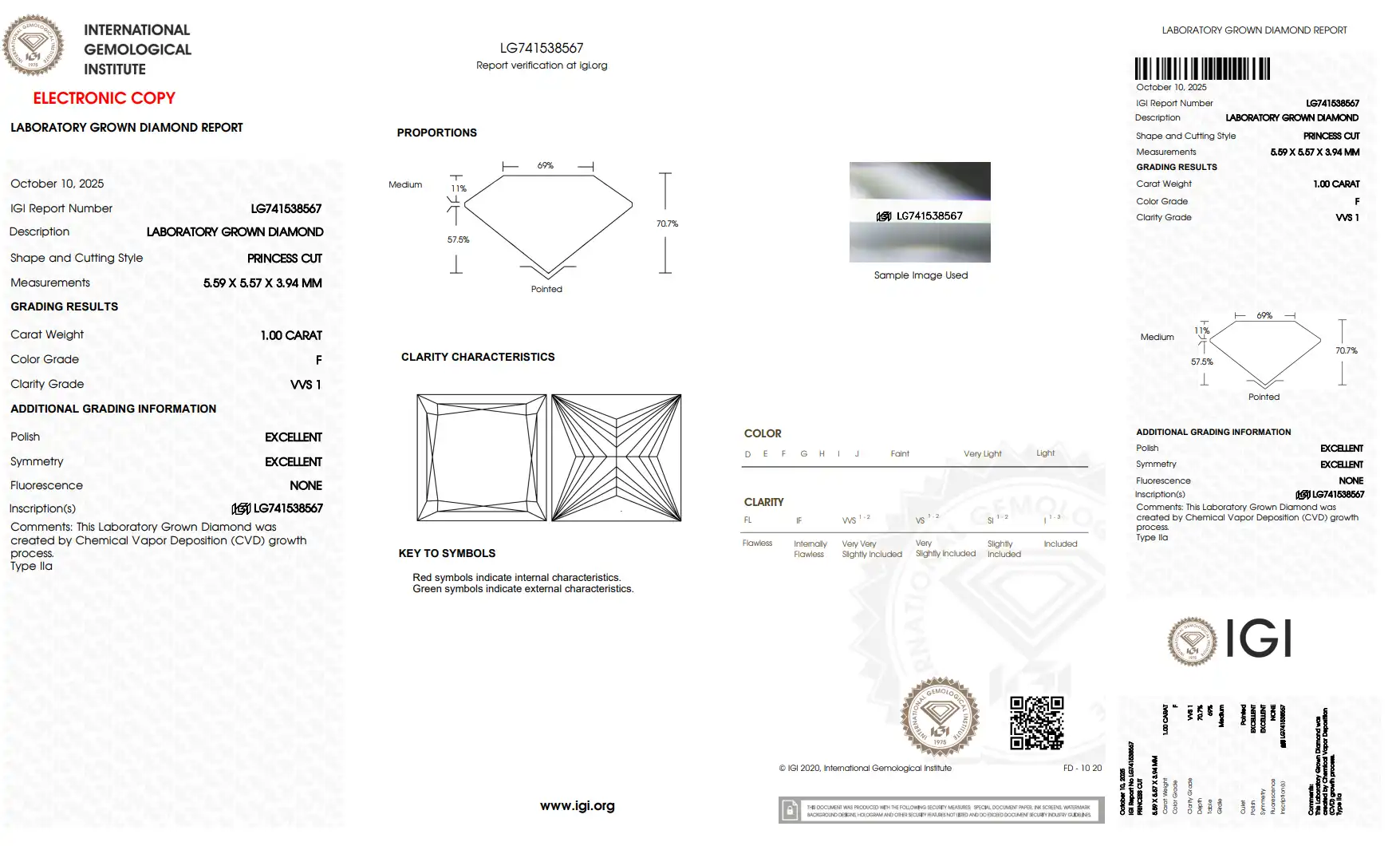 The diamond comes with an IGI laboratory report, verifying that it is lab-grown and detailing its exact specifications (color, clarity, cut, proportions, etc.).