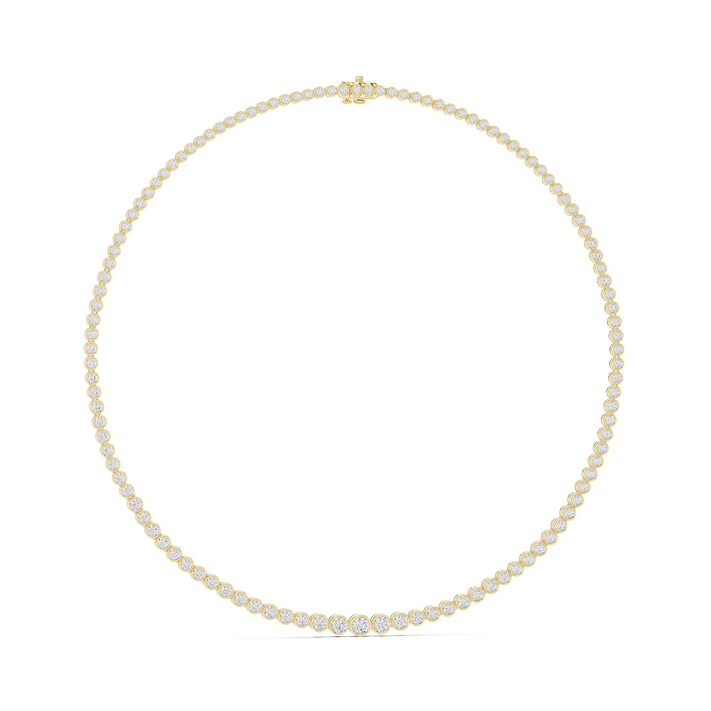 Adorning the necklace are 12 carats of lab-grown round-cut diamonds, selected in the EFG color range with VVS–VS clarity. These diamonds are known for their exceptional brilliance, clarity, and uniform sparkle. The round cut maximizes light reflection, ensuring consistent fire and radiance across the entire necklace. Each diamond is carefully set to maintain symmetry and flow, creating a refined sparkle that complements the gold beautifully. All diamonds are certified, ensuring verified quality, ethical sourcing, and lasting value.