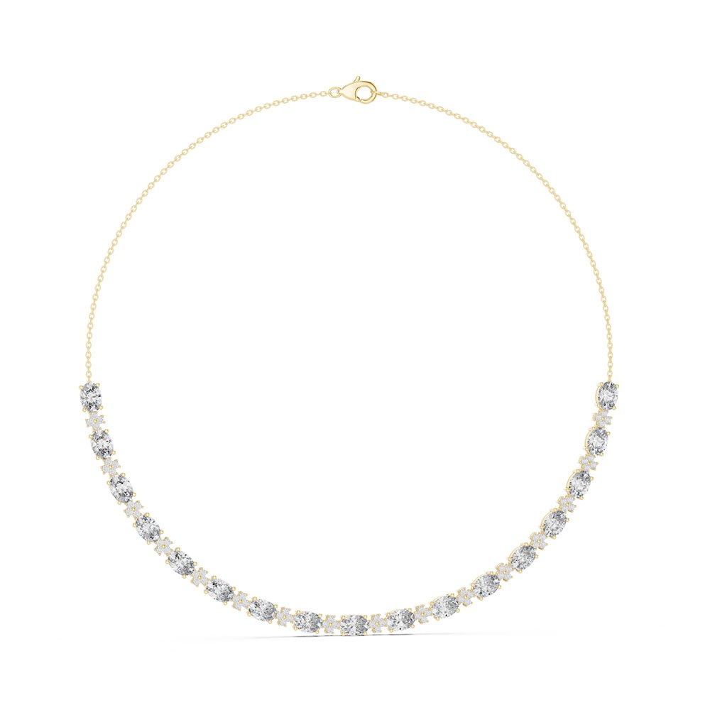 Adorned with an impressive 22 carats of lab-grown diamonds, this necklace delivers extraordinary brilliance and coverage. The diamonds are a sophisticated mix of round and oval cuts, carefully selected to enhance light reflection and create a dynamic visual rhythm. Round diamonds contribute classic fire and symmetry, while oval diamonds add elongation and elegance, resulting in a rich, high-impact design.