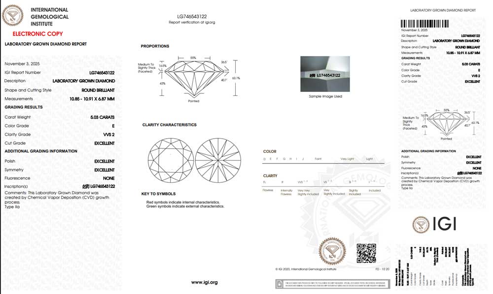 E-VVS2, 5 Carat | Round Lab Grown IGI Certified Diamond