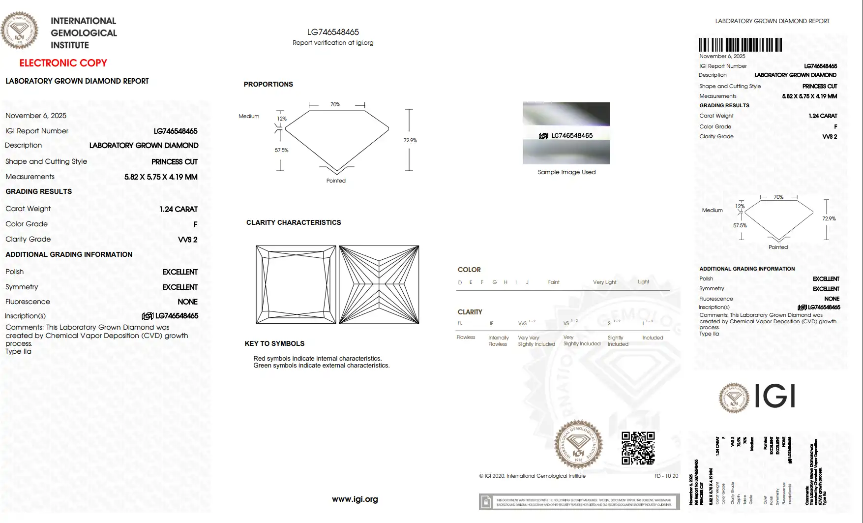 This 1.24 Carat F VVS2 Princess Cut Lab Grown Diamond, verified by the International Gemological Institute (IGI), is a striking example of modern brilliance and exceptional craftsmanship. The diamond’s F color places it firmly in the colorless range, giving it a bright, icy-white appearance that enhances its sharp geometric profile. With a clarity grade of VVS2, the stone contains only minute internal features that are extremely difficult to detect even under magnification, ensuring a clean, uninterrupted sparkle. Its Princess cut, celebrated for its bold square shape and intricate faceting, delivers vivid fire and lively scintillation from every angle. As a lab-grown diamond, it offers the same physical, chemical, and optical properties as natural diamonds while providing an ethical and environmentally conscious choice. Delivering impressive brilliance, crisp symmetry, and contemporary elegance, this 1.24 ct Princess cut diamond is ideal for solitaire rings, modern settings, or statement fine jewellery pieces