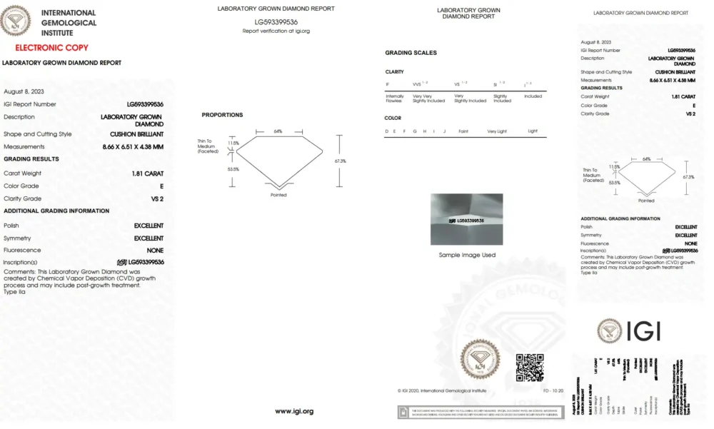 This is a long cushion-cut, lab-grown diamond that weighs 1.81 carats. It has an E color, very white, and a VS2 clarity, meaning very small inclusions. It comes with an IGI certificate.