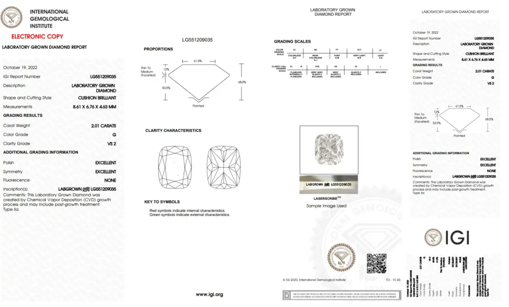 This long cushion-cut diamond is lab-grown and weighs 2.01 carats. It has a G color, nearly colorless, and a VS2 clarity, indicating very small inclusions. It is IGI certified.