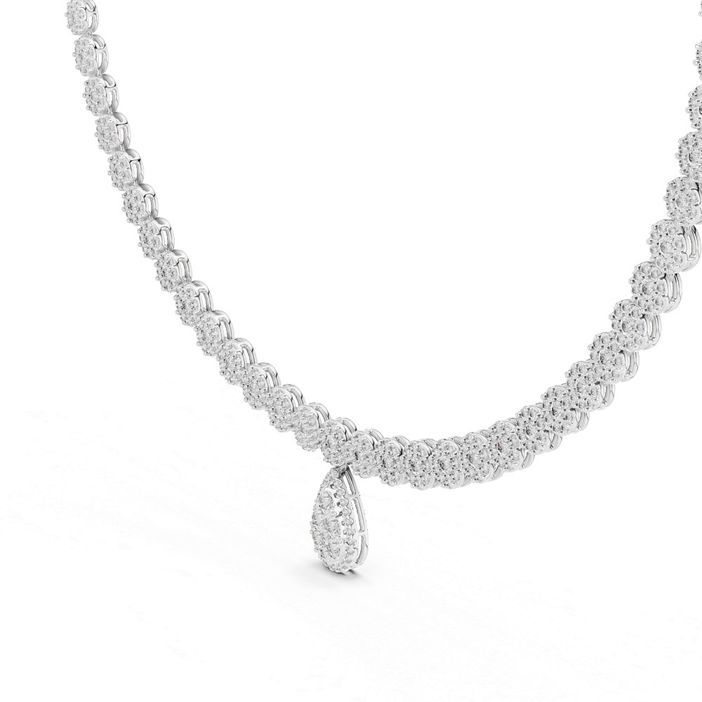 The teardrop accent at the center enhances the necklace’s allure, adding movement, dimension, and a focal point that elevates the overall design. This sophisticated combination of prong-set brilliance and teardrop elegance creates a necklace that is both timeless and contemporary, making it perfect for gala events, weddings, or high-fashion occasions.