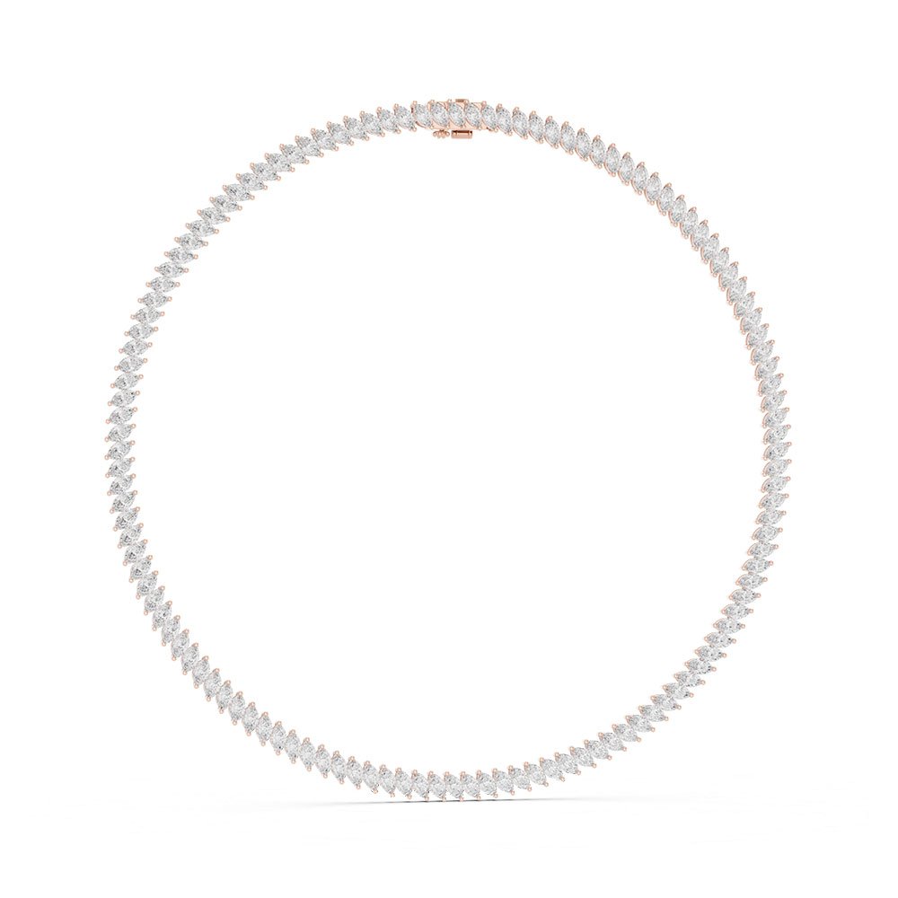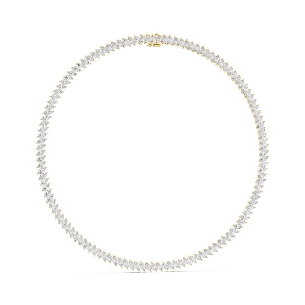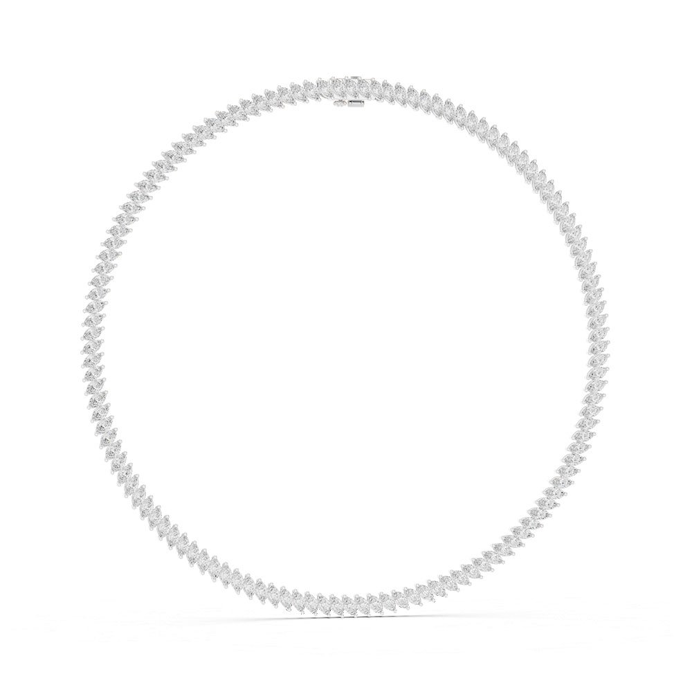 The necklace is adorned with an impressive total diamond weight of 19 carats, featuring carefully selected marquise-cut lab-grown diamonds. Known for their elongated shape and pointed ends, marquise diamonds create the illusion of greater size and enhanced sparkle, making them ideal for statement jewellery. The diamonds are graded DEF in color, ensuring a bright, near-colorless appearance with exceptional visual purity. With VVS–VS clarity, the diamonds exhibit superior transparency and brilliance, with minimal inclusions visible only under magnification.