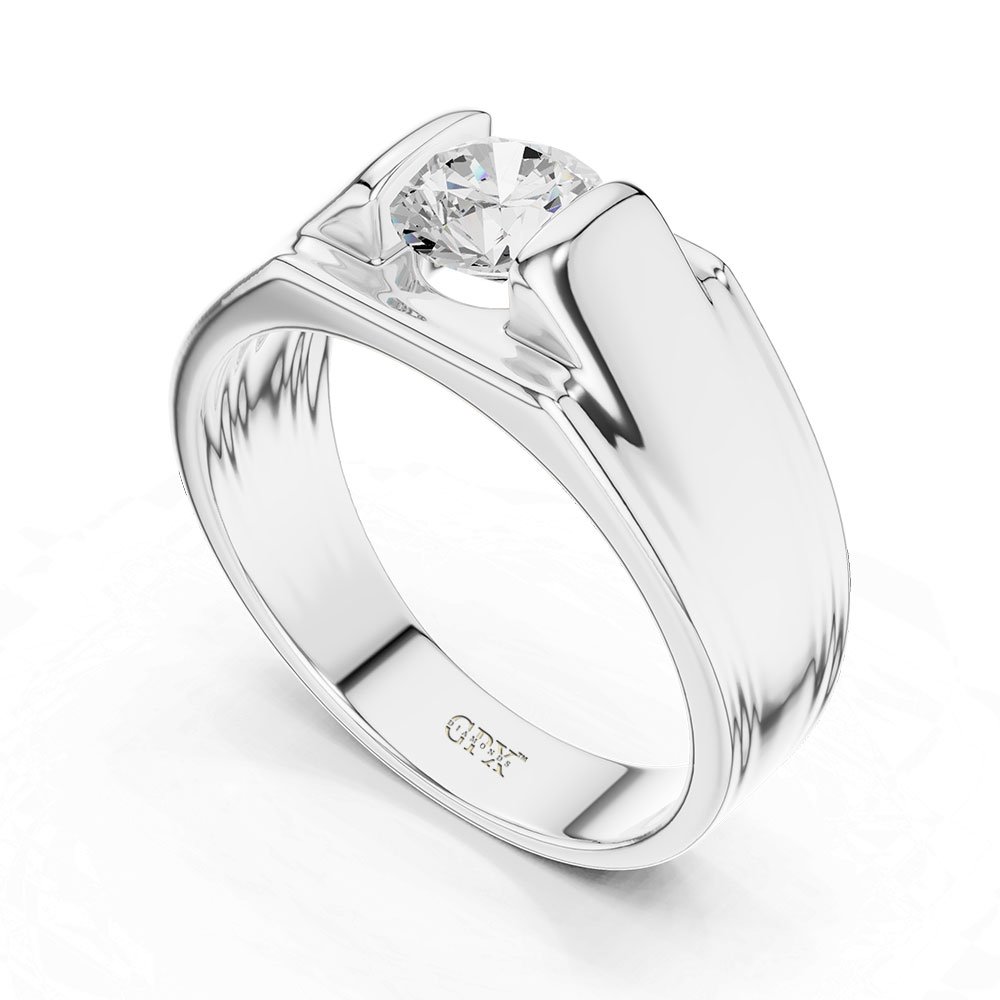 The setting is thoughtfully engineered to securely hold the centre diamond while allowing maximum light to pass through, enhancing its visual impact. Clean lines and a minimalist structure give the ring a powerful, modern appeal without overpowering the diamond itself. This balance makes the ring ideal for men who appreciate understated luxury with strong character.