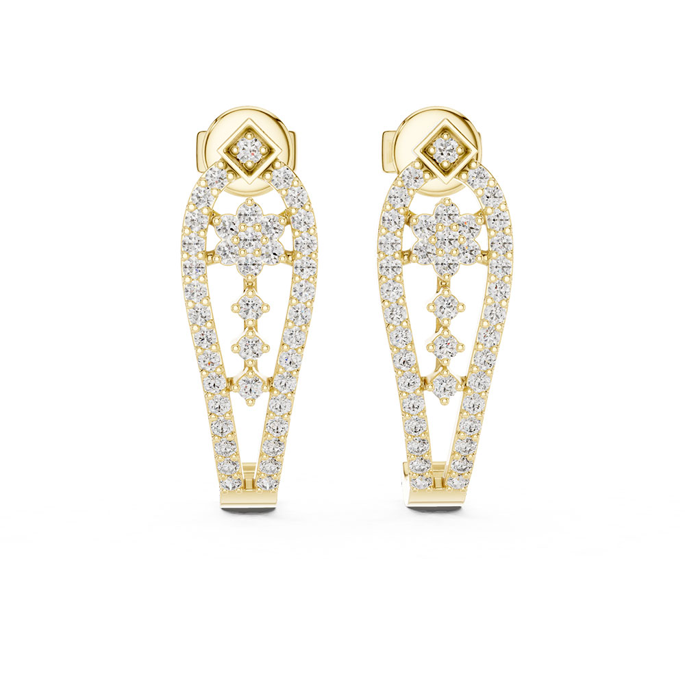 Each earring showcases 0.50 carat + 0.50 carat round brilliant CVD diamonds, selected in the DEF color range with VS–VVS clarity. These certified diamonds are meticulously pavé-set, allowing minimal metal visibility and maximum brilliance. The pavé technique enhances light reflection, resulting in a continuous, refined sparkle that moves beautifully with every step.