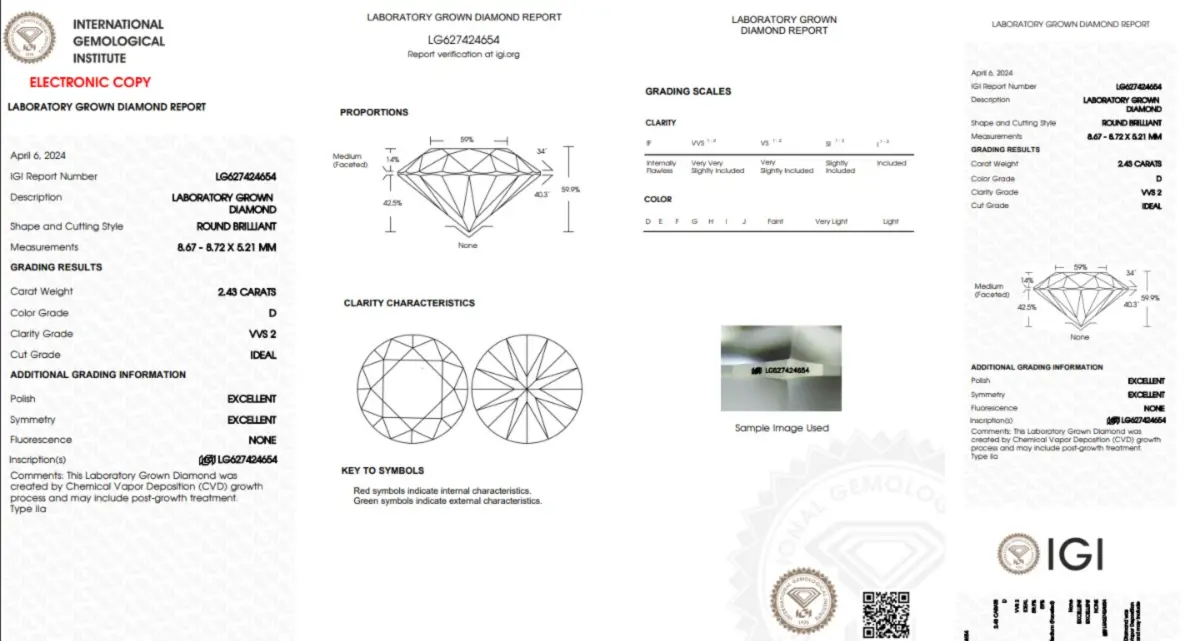 This diamond is round-cut and weighs 2.43 carats. It’s grown in a lab, not mined from the earth. It’s completely colorless (D grade) and has very few tiny flaws (VVS2 grade). IGI, a company that certifies diamonds, has confirmed its quality.