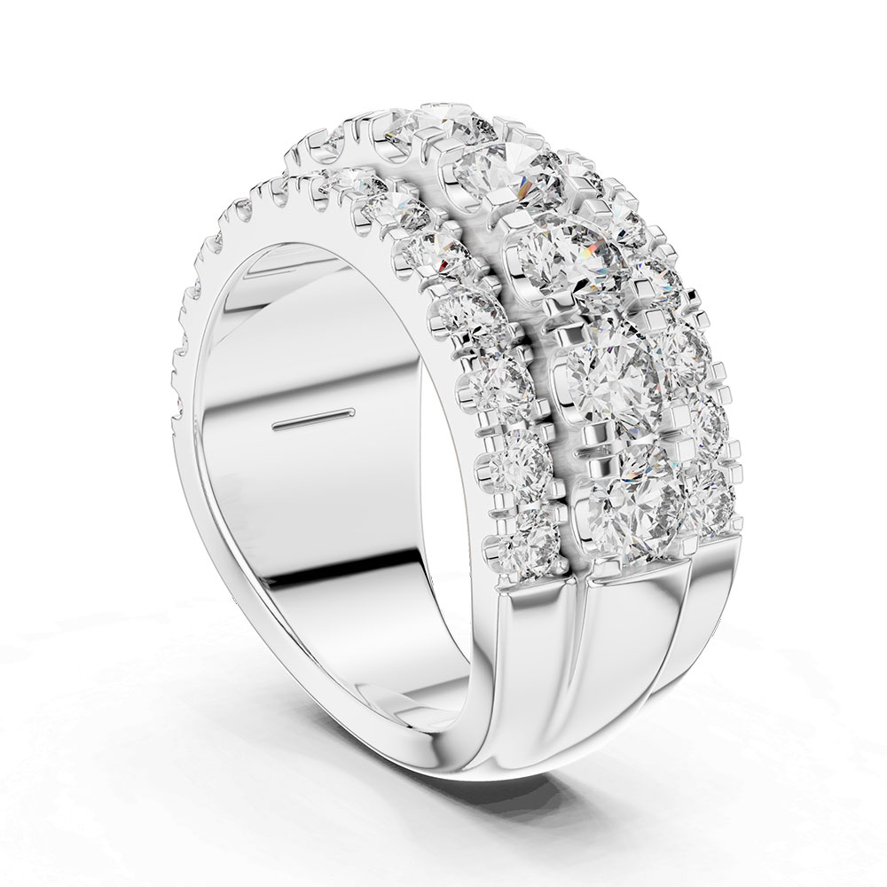 The ring showcases a total of 5 carats of lab-grown round brilliant diamonds, graded DEF color with VVS–VS clarity, offering a luminous white appearance and outstanding brilliance. Round cut diamonds are renowned for their unmatched fire and light performance, and when arranged in a triple-row eternity format, they create an uninterrupted circle of sparkle that reflects light beautifully with every movement. All diamonds are certified, ensuring precise grading, ethical sourcing, and consistent quality across the entire ring.