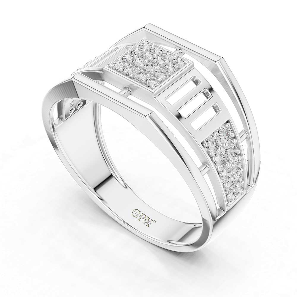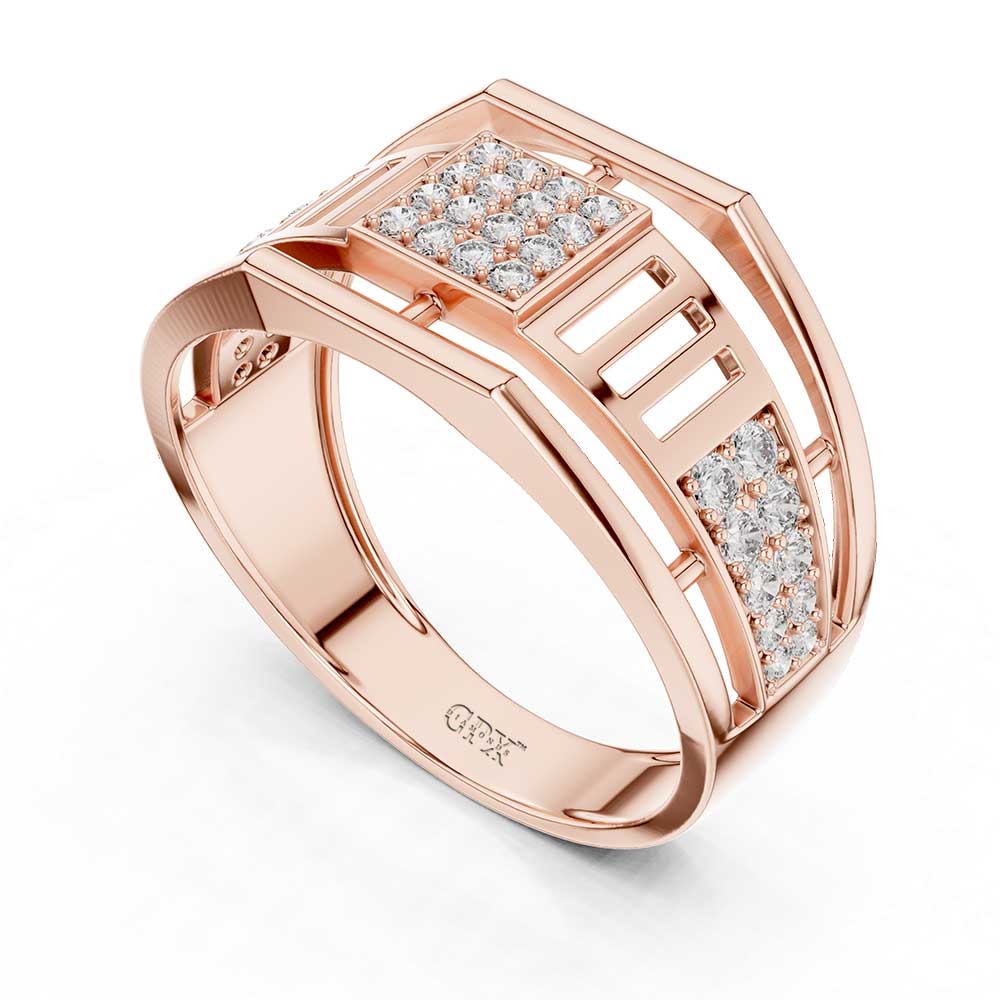 Expertly crafted in 14K or 18K hallmarked gold (with HUID), the ring carries a strong and premium feel. Its structured form adds a distinguished look, making it suitable for workwear, evening outings, or special occasions. At the heart of the design lies a precisely set 0.38 CT cluster of DEF-color, VS–VVS clarity diamonds, offering brilliant sparkle against the bold gold frame. These high-quality diamonds elevate the ring’s entire aesthetic, creating an eye-catching contrast that remains timeless and understated.